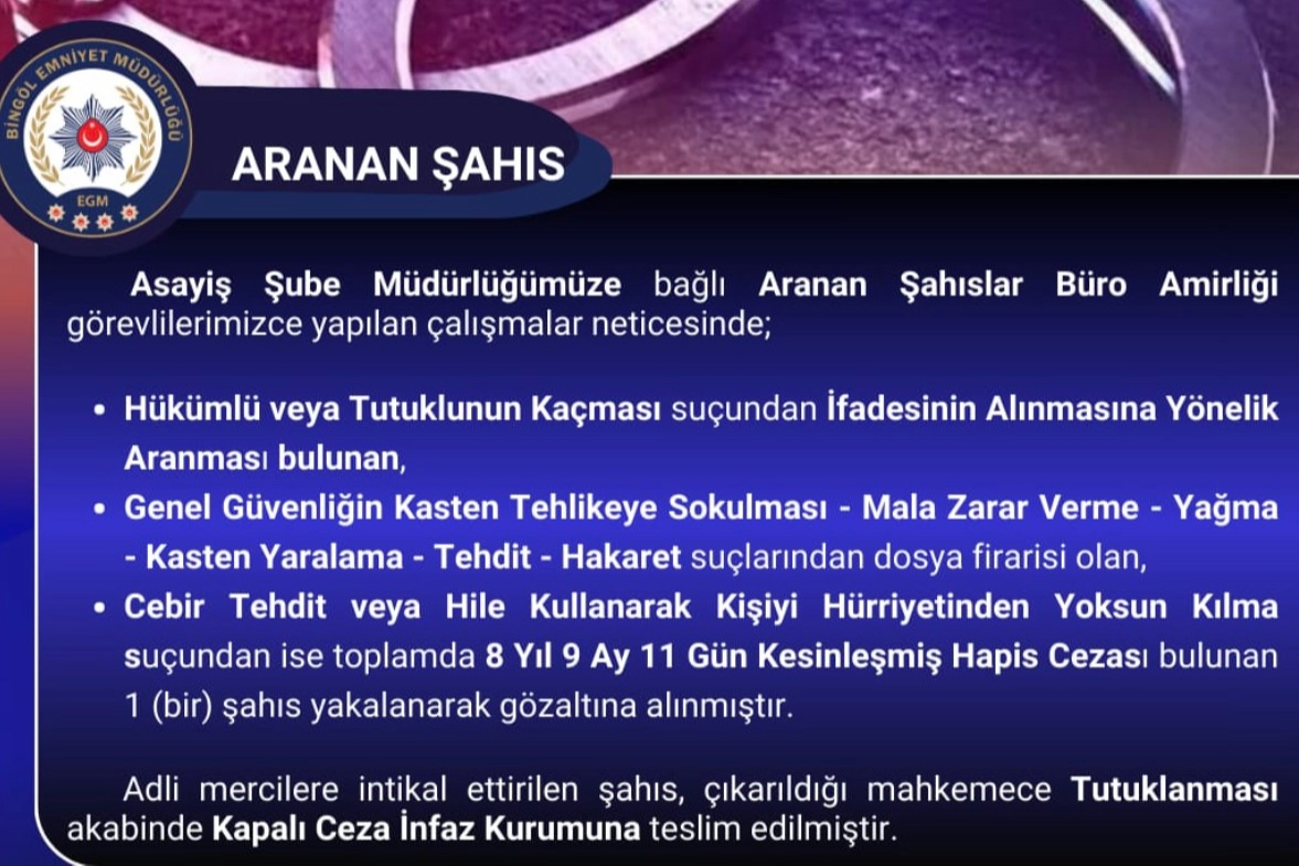 İl Emniyet Müdürlüğü ekipleri kesinleşmiş hapis cezası ile aranan şüphelilerin yakalalanması için çalışmalarını sürdürüyor. Bu çerçevede, ‘Cebir Tehdit veya Hile Kullanarak Kişiyi Hürriyetinden Yoksun Kılma’ suçundan toplamda 8 yıl 9 ay 11 gün kesinleşmiş hapis cezası bulunan 1 şahıs yakalanarak gözaltına alındı. Adliyeye sevk edilen şahıs, tutuklanarak cezaevine gönderildi.