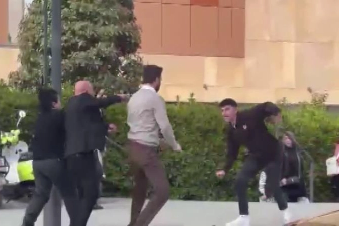 Maltepe’de alışveriş merkezinde bir kişi, şüpheli poşet taşıyan şahısları güvenlik görevlilerine bildirdi. Görevlilerin şüphelileri AVM’den çıkarması üzerine çıkan bıçaklı kavgada 1 kişi yaralandı. O anlar cep telefonu kamerasına yansıdı.