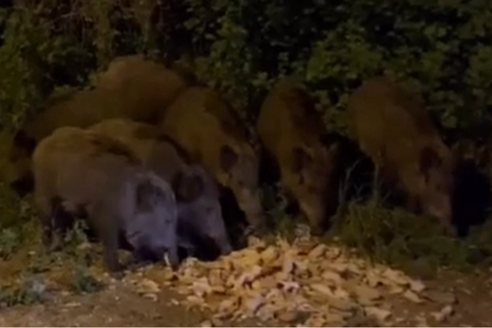 Merkez Nilüfer ilçesi Odunluk Mahallesi'ne aç kalan domuz sürüsü indi. O sırada araçlarıyla yoldan geçen bir aile domuz sürüsünü görünce durdu. Domuz sürüsünün yakınlarında duran aile bir süre sonra yoluna devam etti. Domuz sürüsü ise çöp konteynırlarında yemek aradıktan sonra geldikleri ormanlık alana giderek gözden kayboldu.