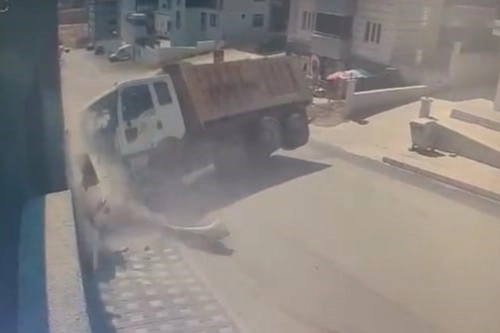 Kaza, saat 15.43'te Fatih Mahallesi Aşık Veysel Caddesi'nde meydana geldi. Yusuf K. (45) yönetimindeki 49 DC 275 plakalı kum yüklü kamyonun yokuş aşağı geri giderken freni patladı. Sürücünün kontrolünden çıkan araç hızla gitmeye başladı. Sürücü hızlanan araçtan atlarken, araç sitenin giriş duvarına çarparak devrildi. Araç devrildiği sırada kaldırımda bulunan bir vatandaş, kaçarak saniyelerle kurtuldu. Yaralı sürücü, kaza yerine sevk edilen ambulansla İnegöl Devlet Hastanesine kaldırıldı. Kaza anı bir iş yerinin güvenlik kamerasına saniye saniye yansıdı.