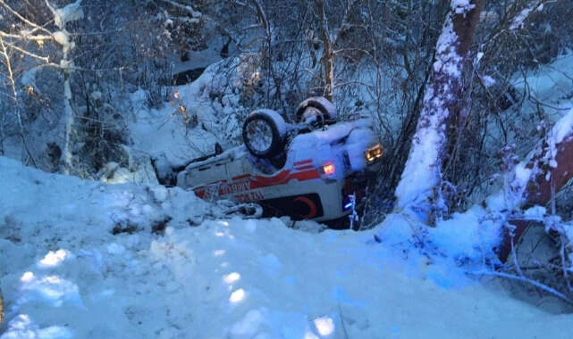 Bursa'nın Mustafakemalpaşa ilçesinde hasta nakline giden 112 ambulansı, yoğun kar yağışı sebebiyle kaza yaparak, ters döndü.