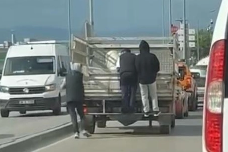 Olay, merkez Osmangazi ilçesi Sanayi Caddesi'nde meydana geldi. 3 genç, canlarını hiçe sayarak açık kasa kamyonetin arkasına tutundu. Bu şekilde seyahat eden gençlerin tehlikeli yolcuğu, amatör kamera ile saniye saniye kaydedildi.