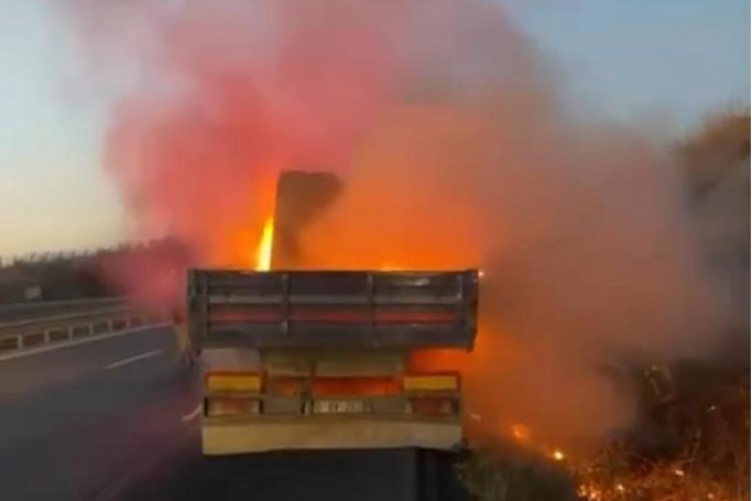 Bursa’nın Mustafakemalpaşa ilçesinde sürücüsünün idaresinde olan tırın dorse kısmında bir anda dumanlar yükseldi. Sürücünün durumu fark etmesiyle araç hemen kenarı çekildi. Hızla büyüyen alevler tırdan anayoldaki otluk alana sıçradı. Sürücünün ihbarı üzerine olay yerine itfaiye ekibi sevk edildi. Alev topuna dönen tırı söndüren ekipler yol kenarında otluk alana sıçrayan alevleri de hızla söndürdü. Tırın alev alev yandığı anlar kameraya yansırken, yangında korkulan olmadı. Olayla ilgili tahkikat başlatıldı.