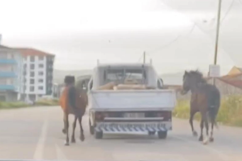 Olay Bursa-Yenişehir Yolu'nda meydana geldi. Kasalı aracıyla aracıyla yola çıkan bir sürücü, 2 atı iple kamyonetin arkasına bağladı. Direksiyon başına geçen sürücü atları trafikte dakikalarca koşturdu. O anları gören vatandaşlar sürücüye tepki gösterdi.