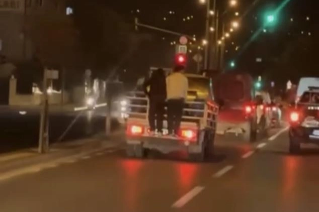 Olay, 35'lik yol üzerinde meydana geldi. Seyir halindeki kamyonetin arkasına asılan duyarsız gençlerin tehlikeli yolculuğu, vatandaşların cep telefonu kamerasına saniye saniye yansıdı. Kaza tehlikesini umursamayan gençlerin pişkin halleri görenleri hayrete düşürürken, o anlar yürekleri ağızlara getirdi.