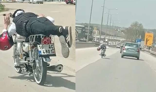 Bursa-Ankara yolunda Bursa yönüne giden kasksız sürücü, motosikletin üzerine yüzüstü yattı. Motosikleti bir süre yüzüstü uzanarak kullanan ve zaman zaman hızını 100 kilometreye kadar çıkaran kasksız sürücüyü görenler cep telefonu kamerasıyla görüntü çekti.
