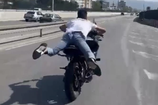 Bursa'da akıllara durgunluk veren olay Mudanya yolu üzerinde yaşandı. Anayola çıkan sürücü seyir halindeki iki tekerlekli aracı yatarak sürmeye başladı. Dakikalarca bu şekilde ilerleyen sürücü hem kendi, hem de trafikteki diğer sürücülerin canını hiçe saydı. Yürekleri ağza getiren görüntü vatandaşların kamerasına yansırken, polis olayla ilgili çalışma başlattı.
