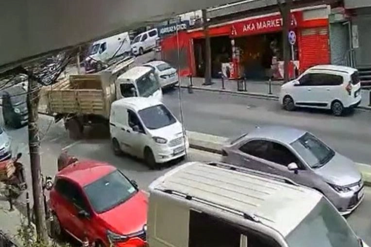 Avcılar’da hızla seyreden kamyonet sürücüsü, önünde aniden duran otomobile çarpmamak için sola manevra yapınca önce önündeki araca, ardından yolun karşı şeridine savrularak park halindeki 3 otomobile daha çarptı. Kaza anı güvenlik kamerasına yansıdı.
