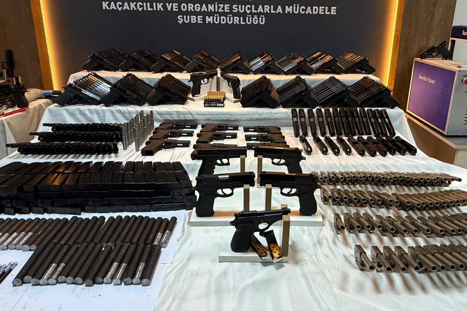 İl Emniyet Müdürlüğü Kaçakçılık ve Organize Suçlarla Mücadele Şube Müdürlüğü ekiplerince Diyarbakır Cumhuriyet Başsavcılığı koordinesinde yapılan çalışmalarda, Bağlar ilçesinde oyuncakçı dükkanı olarak kamufle edilen bir silah atölyesi tespit edildi. Kentte suç gruplarına silah temin ederek haksız kazanç sağlayan şüphelilere yönelik dün 5 adrese eş zamanlı operasyon düzenlendi. Operasyonda oyuncakçı dükkanı olarak kamufle edilen silah atölyesinde 6 ruhsatsız tabanca, 182 adet silah yapımına hazır kurusıkı tabanca, 172 adet yay ve seti bulunan namlu, 199 adet şarjör, 183 adet silah yapımında kullanılan aparat, 136 adet fişek, 3 adet boş sürgü, 20 adet üst kapak, 1 taşlama makinesi, 1 matkap, 1 lazer makinesi, 1 mengene, 170 kredi kartı ve 2 pos cihazı ele geçirildi. Operasyonda gözaltına alınan 4 şüphelinin emniyetteki işlemleri devam ediyor.