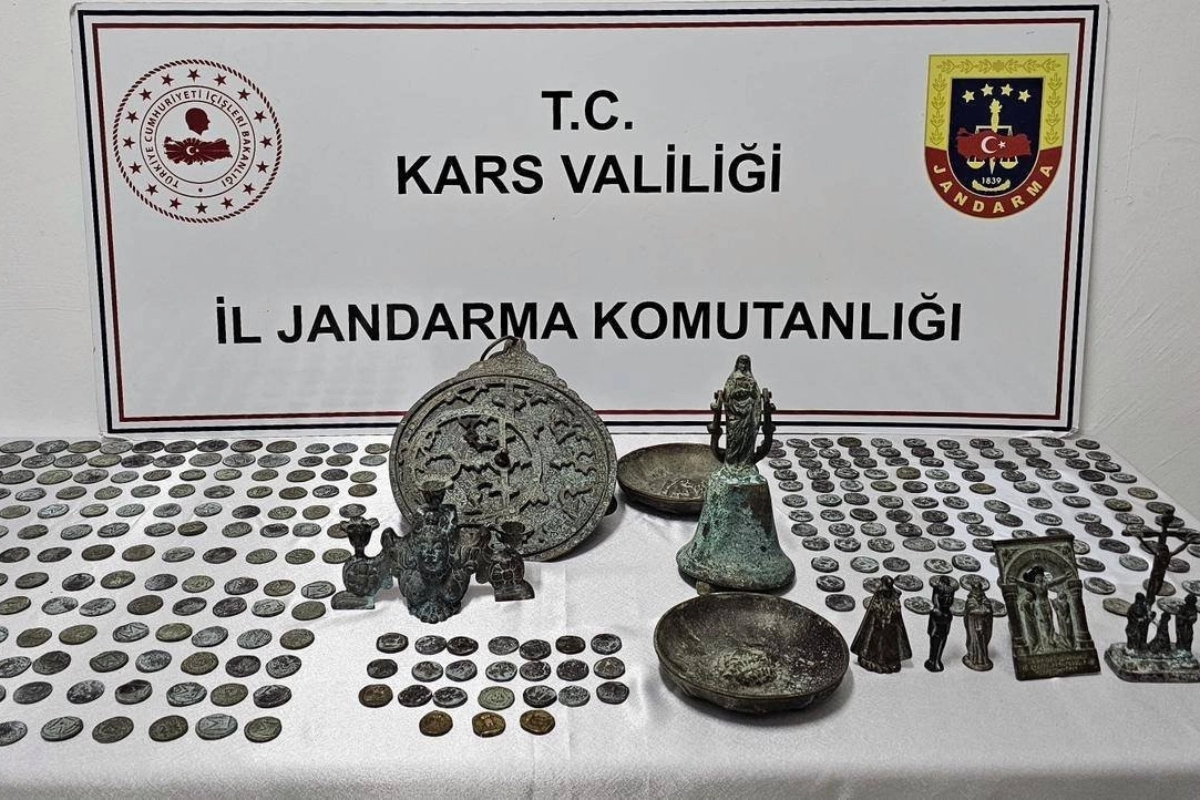 Kars İl Jandarma Komutanlığı Kaçakçılık ve Organize Suçlarla Mücadele Şube Müdürlüğü ekipleri, Sarıkamış Cumhuriyet Başsavcılığı koordinesinde yürütülen çalışmalar kapsamında, 5 kişinin ellerinde bulunan tarihi eser niteliğindeki objeleri satma arayışında olduğu bilgisine ulaştı. Şüpheliler, sikke ve çeşitli objeleri satmak üzereyken düzenlenen operasyonla yakalandı. Operasyonda, şüphelilerin yanında bulunan 3 adet altın sikke, 322 adet bronz sikke, 1 adet şamdan, 1 adet Meryem Ana figürlü çan, 1 adet usturlap, 8 adet heykel ve 2 adet tas ele geçirildi. Ele geçirilen tarihi eserler, Kars Arkeoloji ve Etnografya Müzesi'ne teslim edildi.