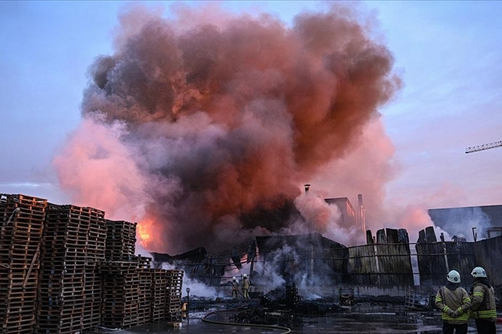 Ekiplerin, çevre iş yerlerine sıçrama riski bulunan yangını söndürme çalışmaları sürüyor.