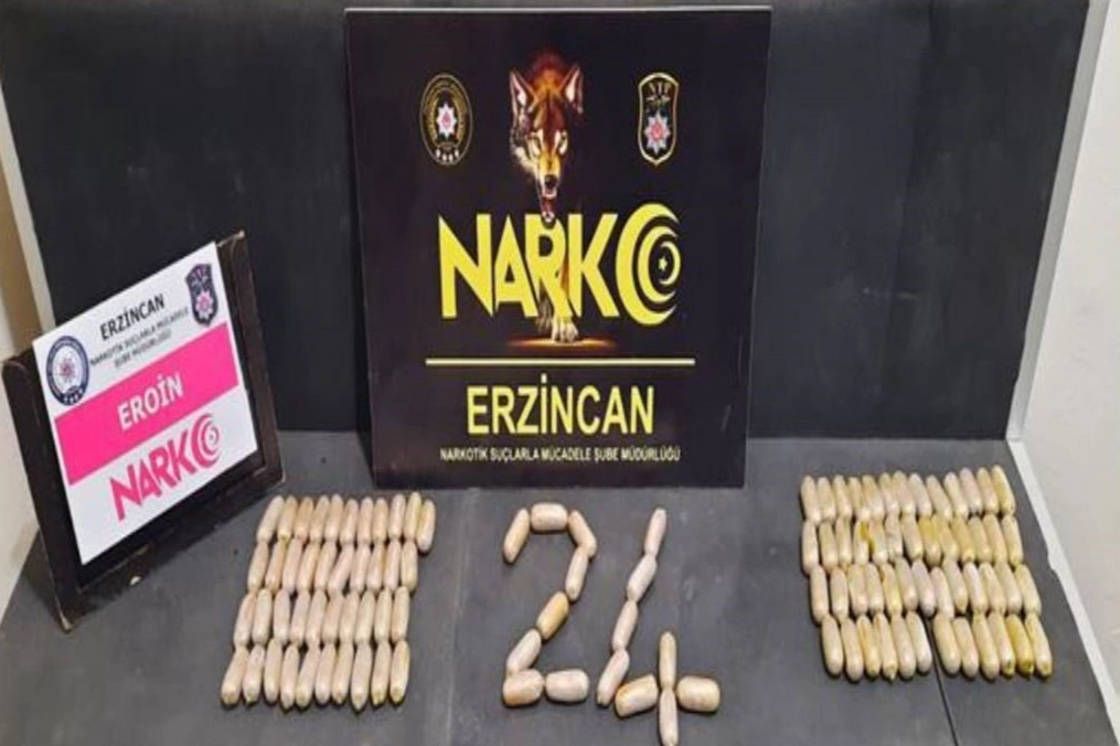 Erzincan İl Emniyet Müdürlüğü Narkotik Suçlarla Mücadele ve İstihbarat Şube Müdürlüğü ekiplerince, terörün finans kaynağı olan kaçakçılık ve uyuşturucu madde ticareti/sevkiyatının önlenmesine yönelik yürütülen çalışmalar kapsamında; şüphe üzerine durdurulan 48 plakalı otobüste yapılan aramada, "yutma yöntemi" kullanarak uluslararası uyuşturucu madde ticareti yaptığı değerlendirilen şahısların mide ve bağırsaklarında; 50 adet kapsül şeklinde toplam ağırlığı 428,08 gram net ağırlığı 363,07 gram gelen eroin maddesi, 59 adet kapsül şeklinde toplam daralı ağırlığı 472,80 gram net ağırlığı 417,62 gram gelen eroin maddesi ele geçirildi.