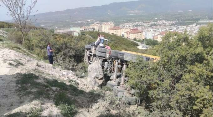 Devrilen tırın sürücüsü Fadık Dinsever çevreden yetişen başka sürücüler tarafından araç içinden çıkarıldı.