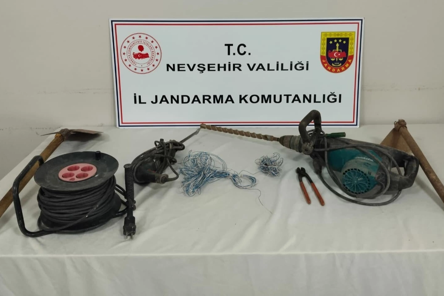 Derinkuyu ilçe Jandarma Komutanlığı ekipleri; ilçeye bağlı Özlüce köyünde drone ile asayiş uygulaması yaptı. Yapılan uygulama esnasında 5 şahsın kaçak kazı yaptığı tespit edildi. Şahısların yakalanması için çalışma başlatan jandarma ekipleri; N.E., D.E, F.T., Y.K. ve Ç.Ç.'yi kaçak kazı yaparken yakaladı. Yapılan çalışmada ayrıca kaçak kazıda kullanılan 1 adet beton kırma makinesi, 1 adet kürek, 20 metre elektrik kablosu, ve TCK Md.174/1 kapsamında değerlendirilen 1 adet EYP düzeneği ele geçirildi.