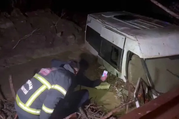Alınan bilgiye göre, plakası ve sürücüsü öğrenilemeyen minibüs, sağanak sonrası oluşan sele kapılarak yol kenarındaki dereye düştü.