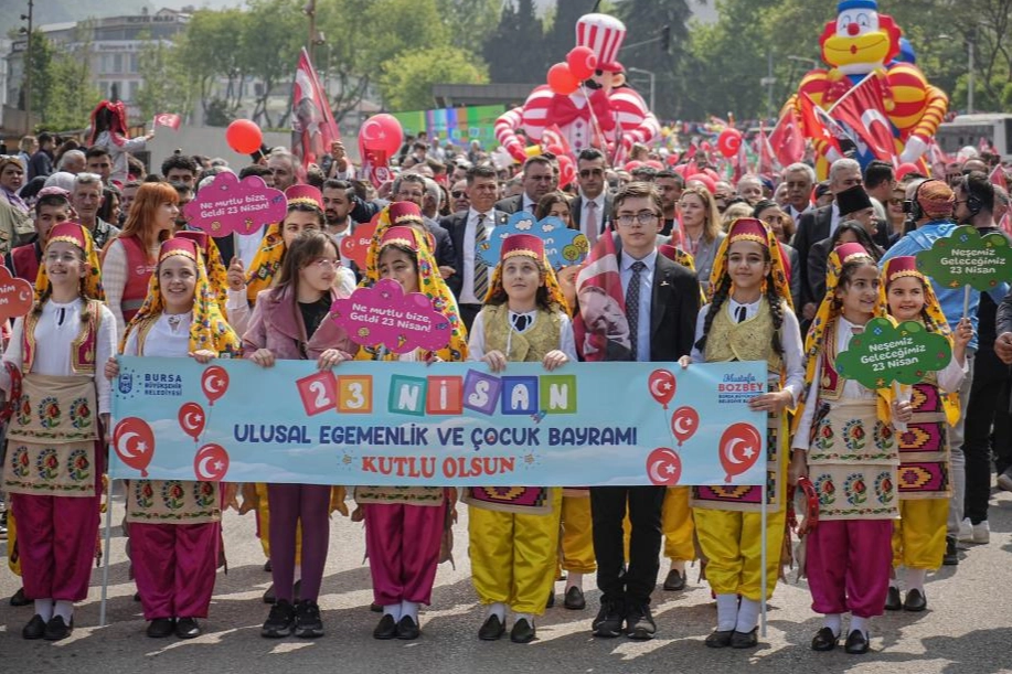 23 Nisan Ulusal Egemenlik ve Çocuk Bayramı tüm Türkiye'de olduğu gibi Bursa'da da büyük bir coşkuyla kutlandı. Bursa Büyükşehir Belediyesi tarafından 'Onların Gülüşü Hepimizin Yarını' teması ile hazırlanan '23 Nisan Çocuk Şenliği'nde çocuklar, dolu dolu program içeriğiyle unutulmaz bir gün geçirdi. 23 Nisan coşkusu, yüzlerce çocuk ve ailelerinin katılımıyla Altıparmak Caddesi'nden Merinos Parkı'na doğru yapılan kortej yürüyüşüyle başladı. Ellerindeki Türk bayraklarıyla marşlar söyleyerek ve şiirler okuyarak yürüyen çocuklara, Büyükşehir Belediye Başkanı Mustafa Bozbey ve eşi Seden Bozbey ve CHP İl Başkanı Nihat Yeşiltaş da eşlik etti.