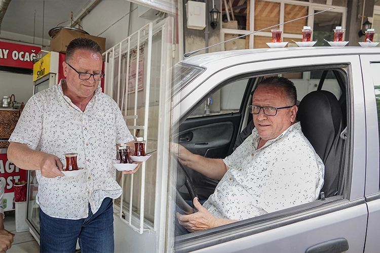 Bursa'da Osmangazi ilçesinde esnaf Ali İhsan Olcay, dükkanına 50 metre yakınındaki çay ocağından aldığı çayları, dükkanına kadar kendi otomobiliyle taşıyor. Kimi zaman komşularına da otomobiliyle çay servis eden Olcay, hem espri olsun diye hem de pratik olmasından dolayı bu şekilde taşıdığını söylüyor. Bu güne kadar ne bardak kırdığını ne de çayı dökmediğini belirten Olcay, aracıyla çay taşıdığı görüntülerin sosyal medyaya düşmesinden sonra nazar gelmesinden endişe ediyor.