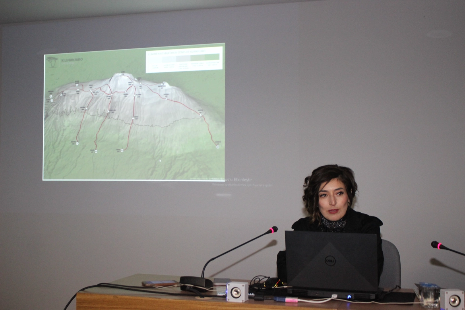 1-10 Şubat 2025 tarihleri arasında Tanzanya’da bulunduğunu, 2-8 Şubat tarihlerinde de Kilimanjero zirve tırmanış ve inişini gerçekleştiğini söyleyen Yüksek Mimar Zehra Sönmez, çektiği fotoğraflarla yaptığı sunumda, “Tırmanışımı ve inişimi 7 kişilik ekibimde yer alan rehberler yanı sıra diğer görevlilerle birlikte 6 günde 65 kilometre yürüyerek tamamladım. Almanya başta olmak üzere en çok Avrupa ülkelerinden dağcılar Kilimanjero’ya gidiyor ve yılda 40 bin dağcı tırmanış yapıyor” şeklinde konuştu.