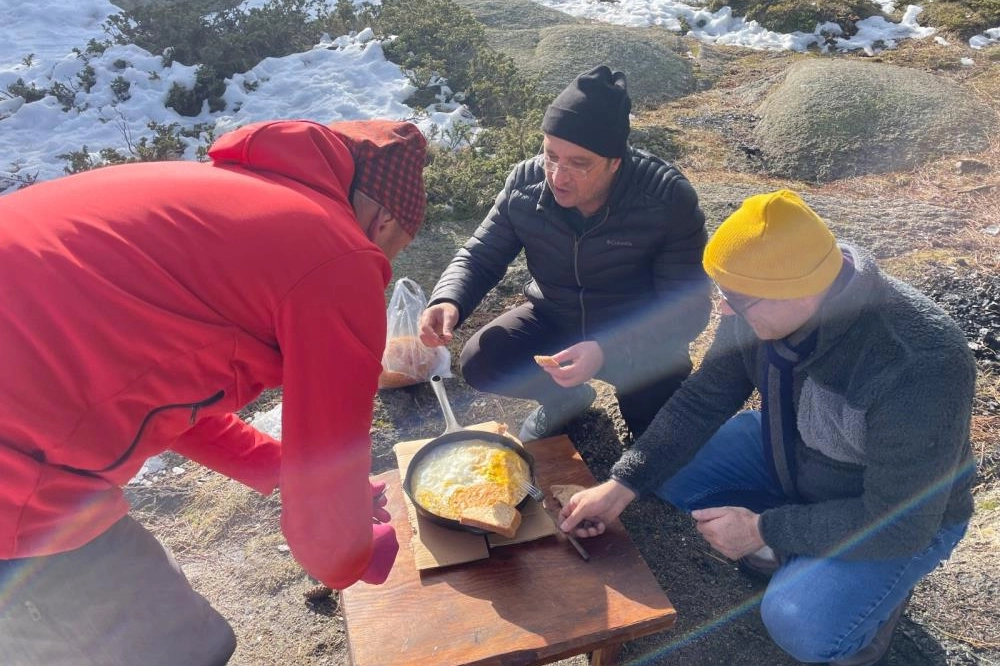 Bursa'da doğada yemek yapan 53 yaşındaki Süleyman Ateştepe, yaklaşık 1500 kilometre uzaklıktaki Ağrı Dağı eteklerinden getirttiği deve kuşu yumurtasını Uludağ'da karlar üzerinde yaktığı ateşte tavada pişirdi.