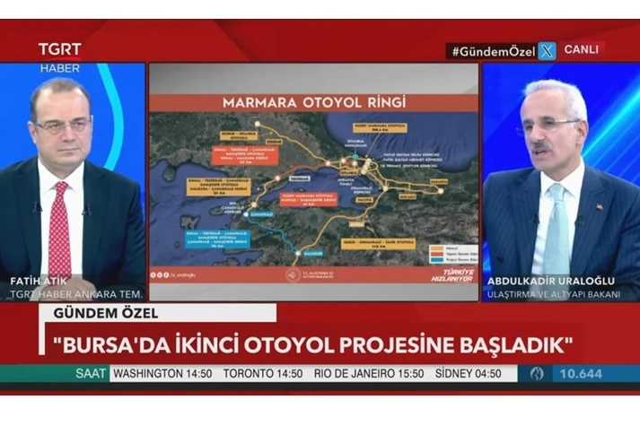 TGRT Haber’de gündem özel programına konuk olan Bakan Uraloğlu, Osmangazi Köprüsü’nün ve İstanbul İzmir Otobanı’nın trafiğe çok önemli katkılar sunduğunu daha önceleri 8,5 saat süren yolculuğun 3,5 saate düştüğünü kaydetti. Osmangazi Köprüsü’nün günlük geçiş garantisinin 40 bin araç olduğunu, bugün ortalama 60 bin aracın köprüyü kullandığını hatırlatan Bakan Uraloğlu, otobanda da 4-14 Nisan bayram tatili süresince 2 milyon 857 bin 657 aracın geçtiğini ve rekor kırıldığını hatırlattı. Osmangazi Köprüsü’nün 2016 yılında açıldığını ifade eden Bakan Uraloğlu, “Eskiden İstanbul’dan İzmir’e 8,5 saat süren yolculuktan bahsediyoruz. Bayramlar hariç. Şu anda 3 saat hatta 3,5 saatte biten yolculuk. Bu köprü ve otoyolu yapmamış olsaydık 12 saat süren yolculuk yaşanacaktı. Kamu yatırımlarının yapılmasıyla ilgili birkaç yöntem var. Ankara İzmir otoyolunu dış kredi ile yapıyoruz. Çalışmalarımız devam eden Kapıkule Çerkezköy arasında milli bütçeden yapılan bölüm ve dış kredi ile yapılanı var. Yap işlet devret üçüncü alternatif. Burada projeyi yaparken oraya koyduğumuz sayıları geçmiş durumdayız. Öngörülen trafikle beraber, kaç lira geçiş ücreti olursa finanse edilir, bunu dikkate alarak afaki olmadan yapıyoruz. Osmangazi köprüsünde garanti edilen geçiş sayısı 40 bindir. Şu andaki ortalama günlük 60 bindir. Sayının 1,5 katına geldik. Bayramda 13 Nisanda 117 bin araç geçti ve rekor kırıldı. Ücret noktasında henüz karşılamıyor. Vatandaşımız daha rahat geçsin diye ücretleri indirim yaparak firmaya uygulatıyoruz. Karayolları Genel Müdürlüğü’nün kendi işlettiği otoyolları fiyat güncelmesine dahil edelim. Osmangazi Köprüsü’nü açtığımızda geçiş ücreti 35 dolardı, 15 dolara indirip açmıştık. Aynı zamanda o dönemde 20 litre akaryakıta karşılık geliyordu. Bugün 900 lira gibi bir rakam yapar. Ancak güncelleme ile yarısına geldik. Vatandaşlarımızı ve nakliyecileri rahatlatacak bir durumda olduğumuzu söyleyebilirim” dedi İstanbul İzmir otobanında en yoğun bölgenin Bursa olduğuna dikkat çeken Bakan Uraloğlu, “Bursa’da mevcut çevre yolu aynı zamanda şehir içi gibi kaldı. Günlük araç geçişleri 100 binleri geçti. Orada daha kuzeyden ikinci bir otoyol projesine başlandı. Orayı çözeceğiz. 40 kilometre civarında yeni bir otoyol yapacağız. Bursa geçişini kapsayacak bir otoyol olacak. İstanbul’dan gelip Osmangazi Köprüsü’nü geçip Bursa’ya girişte yani Ovakça yakınlarında mevcut çevre yoluna gelmeden kuzeyden ayrılıp Bursa’yı kucaklayıp Susurluk istikametine doğru gidip bağlayacak olan bir yeni yol yapıyoruz. Başladık. Burayı rahatlatmış olacağız.” İfadelerini kullandı Demiryolu ulaşımının rahatlamasıyla Bursa’nın daha da önem kazanacağına vurgu yapan Bakan Uraloğlu, “Eskişehir üzerinden Bursa’ya bağlanacak projemiz var. İstanbul’dan bir anda yüksek hızlı trenle İzmir’e gelecek bir bağlantı yapmış olacağız” diyerek Ankara Bursa hızlı tren projesine dikkat çekti.