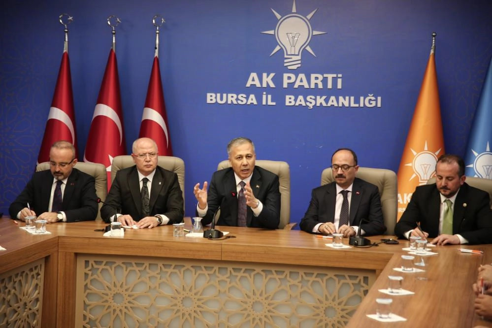 İçişleri Bakanı Ali Yerlikaya, Bursa’da Güvenlik Toplantısı’na katılmadan önce bir dizi ziyaret gerçekleştirdi. İlk olarak Bursa Valisi Mahmut Demirtaş’ı ziyaret eden Yerlikaya, ardından AK Parti Bursa İl Başkanlığı’nda partililerle bir araya geldi. Burada terörle mücadeleden uyuşturucuya, düzensiz göçle mücadeleden çetelere yönelik operasyonlara kadar yaptıkları çalışmalar hakkında açıklamalarda bulunan Bakan Yerlikaya, İçişleri Bakanlığı olarak ‘Türkiye’nin huzuru’ dediklerini belirterek, “Eğer huzur varsa, diğerleri ondan sonra gelir. Göreve ilk geldiğimiz günden itibaren 600 bin personelle beraber çalışıyoruz. Biz buna artık yürekten bir ifade ile ‘İçişleri ailesi’ diyoruz. Emniyetimiz, jandarmamız, sahil güvenliğimiz ve bağlı kuruluşlarla beraber 365 gün 7/24 milletimizin emrindeyiz” dedi.