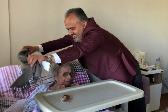 Bursa'nın Yenişehir ilçesine bağlı Çeltikçi köyünde yaşayan sağır dilsiz yatalak felç hastası 63 yaşındaki Sayide Ağır'ın yardım sesini duyan ve tedavi edilerek huzurevine yerleşmesini sağlayan Bursa Büyükşehir Belediye Başkanı Alinur Aktaş, Sayide teyzeyi unutmayarak kendisine sürpriz ziyaret gerçekleştirdi.