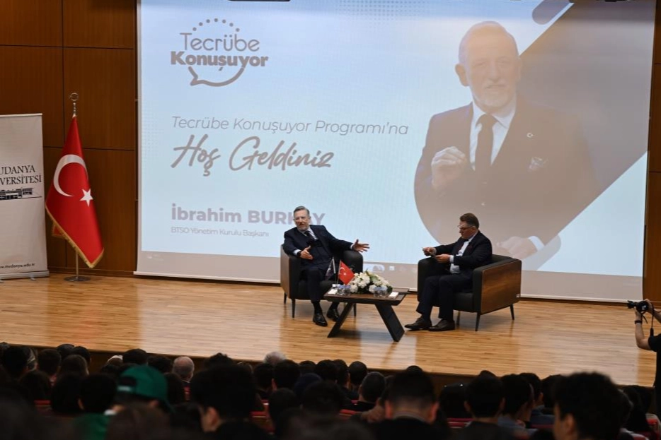 Mudanya Üniversitesi Genel Sekreteri Ali Mollasalih’in moderasyonunda gerçekleşen söyleşide konuşan BTSO Yönetim Kurulu Başkanı İbrahim Burkay, Mudanya Üniversitesi’ni üçüncü kez ziyaret ettiğini ve her gelişinde çok etkilendiğini ifade etti. Burkay, "Mudanya Üniversitesi Bursa ve ülkemize eğitim alanında yapılmış çok büyük bir yatırım. Bu yatırımlar ancak vizyon sahibi, eğitime gönül vermiş insanların adanmışlığıyla ortaya çıkıyor. Böyle güzel bir eseri ülkemize ve gençlerimize kazandırdığı için Gıyasettin Bey’e teşekkür ediyorum." dedi. İbrahim Burkay etkinlikte iş hayatındaki tecrübelerini gençlerle paylaşırken, kariyer planlarıyla ilgili de tavsiyelerde bulundu. Burkay, eğitim hayatından sonra aile şirketlerinde görev yapmaya başladığını; dış ticaret, ekonomi ve finans alanında uzmanlaştığını kaydetti. Sivil toplum hayatına girişinin ise 2005 yılında Uludağ Tekstil İhracatçıları Birliği Başkanlığına seçilmesi ile başladığını söyleyen Burkay, "O zamana kadar en büyük önceliğim şirketimdi. Yılın büyük genelini yurt dışında geçirirdim. Ancak sivil toplum kuruluşlarında görev aldığınızda kendi meseleniz öncelik olmaktan çıkıyor. Temsil ettiğiniz kesimlerin konularına çözüm üretmek zorundasınız. Dolayısıyla ihracat ailesinin dertleri benim temel önceliğim oldu. Bu durum hem vizyon ve proje geliştirme hem de karar verme yeteneğimi geliştirdi" dedi.