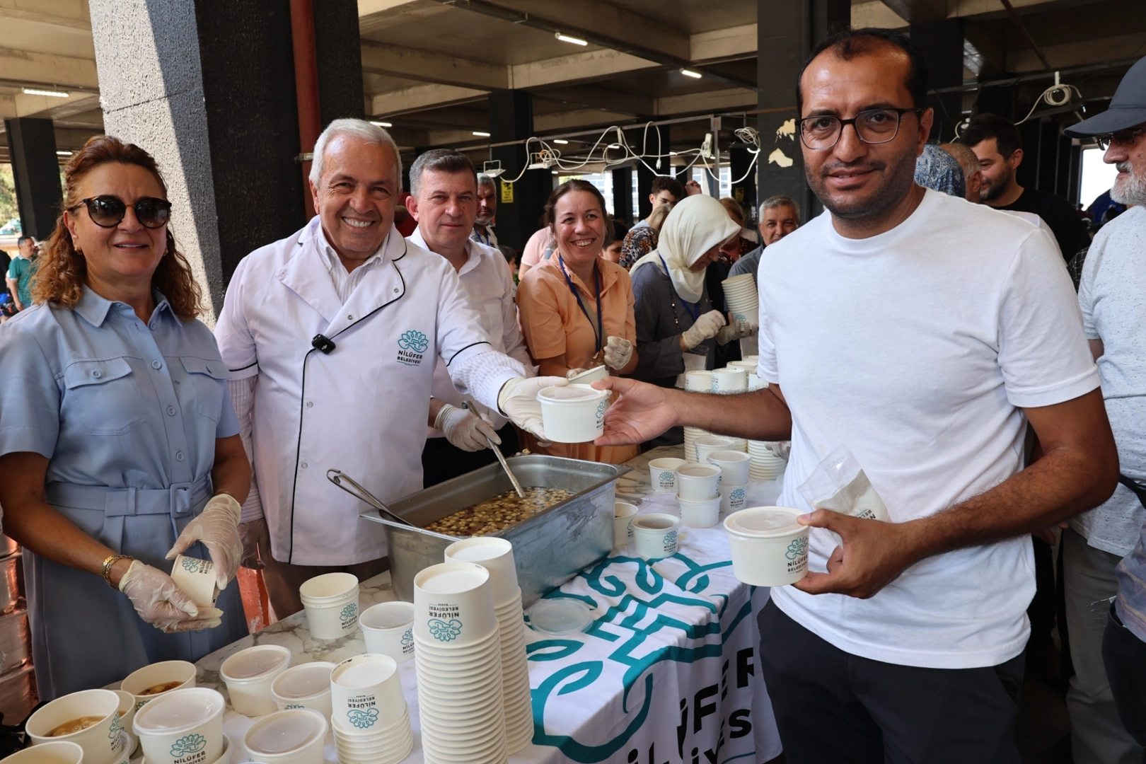 Önlük ve eldiven giyip, kazanının başına geçen Başkan Şadi Özdemir, bekleyen vatandaşlara bolluk ve bereket dilekleriyle aşure ikram etti. Başkan Şadi Özdemir, daha sonra aynı alanda kurulan pazar yerini gezerek, esnaflar ve vatandaşlarla sohbet etti.