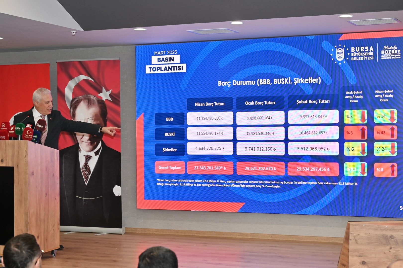 Su kaynaklarını korumak ve geleceğe güvenle taşımak için kararlı olduklarını vurgulayan Başkan Bozbey, sürdürülebilir su yönetimi politikalarını hayata geçirdiklerini ifade ederek, bu mücadelede herkese önemli görevler düştüğünü söyledi. BUSKİ’nin borçları hakkında da bilgi veren Başkan Bozbey, “Büyükşehir’in, BUSKİ’nin ve şirketlerin toplam borçları 29.5 milyar TL. Toplam borç üzerinden baktığımızda 2 milyar 300 milyon TL civarında borcu azalttık. Ancak BUSKİ’nin borcu artıyor. Nisan ayında 11 milyar 554 milyon TL olan borç Şubat ayında 16 milyar 464 milyon TL’ye yükseldi. Son yaşanan olumsuzluklardan dolayı kur 2 TL arttı. Her bir lira artışta BUSKİ’nin borcu 350 milyon TL civarında artıyor. 2 TL artınca 700 milyon TL BUSKİ’nin borcu yükseldi. Yüzde 75’i dövizli borç. Konsolide borçlara baktığımızda Nisan ayında 986 milyon dolardı, Şubat ayında 811 milyon dolara indirdik. Bunları tasarrufla, iyi bir mali disiplin uygulayarak, verimliliği artırarak başardık. BUSKİ’nin iç borcu 1 milyardan 896 milyon TL’ye düşerken, dış borcu 8 milyar 156 milyondan 13 milyar 488 milyona yükseldi.” dedi.