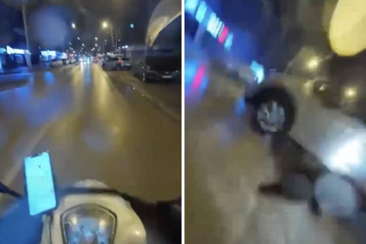 Kask kamerası görüntülerinde, cipin aniden yola çıkması, yağışın etkisiyle motosiklet sürücüsünün kontrolü kaybettiği ve panik anları yer alıyor.