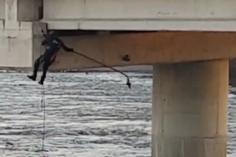 Bursa'nın Karacabey ilçesinde, köprü altında asılı kalan güvercinlerden biri olay yerine halatla inen Büyükşehir itfaiye ekipleri tarafından kurtarıldı.