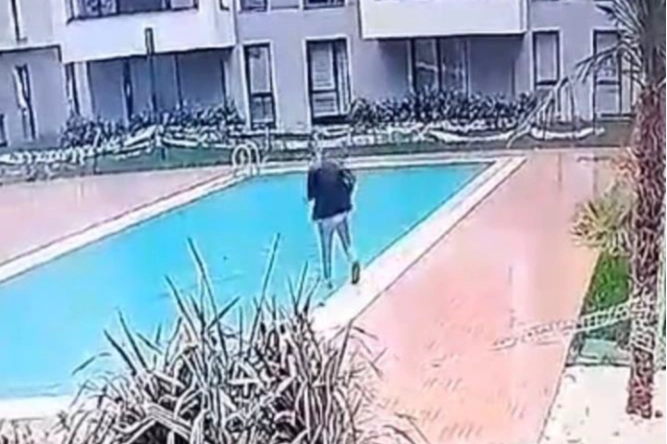 Kuryenin iş kazası sitenin güvenlik kamerasına an be an yansıdı. Görüntülerde kuryenin dalgın bir halde yürüdüğü, havuza düştüğü ve çıkmak için çaba sarfettiği kayda geçti.