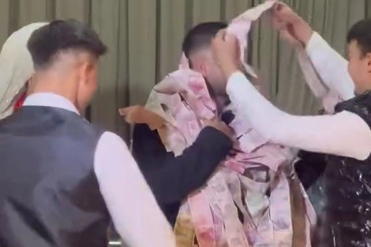 Bursa’da düzenlenen bir düğünde ilginç görüntüler yaşandı. Beyda ve Enes çiftinin mutlu gününde takı merasiminde salona getirilen metrelerce uzayan para şeridi davetlilerin dikkatini çekti. Davetliler arasında şaşkın bakışlar olurken, bazı misafirler telefonlarına sarılarak o anları kayda aldı. 50 metre boyunca uzanan para şeridinin damadın üzerine tek tek dolanması renkli görüntülere sahne oldu.