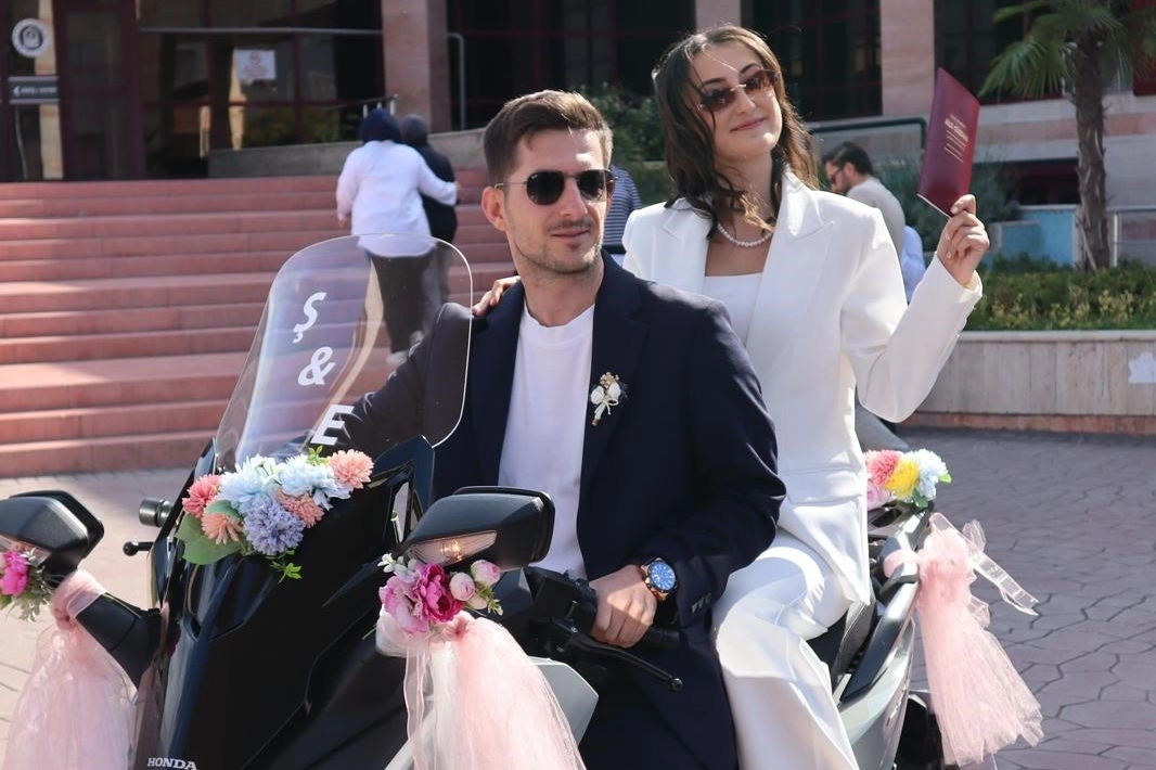 Nikâhın ardından motosikletlerini çiçek ve tüllerle süsleyen çift, düğün konvoyuna ilginç bir renk kattı. Gelinlik yerine beyaz takım tercih eden Şule Albayrak Çağın ve damat Emre Çağın, süslenmiş motosikletleriyle şehir turuna çıktı. Renkli görüntülere sahne olan anlarda çevredeki vatandaşlar çifti alkışlayarak mutluluklarına ortak oldu.