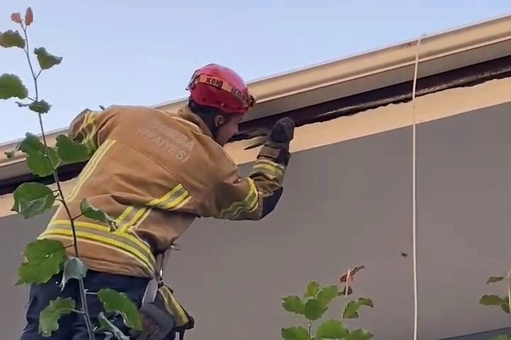 Olay, İnegöl Fatih Mahallesi Özbey Sokak’ta bulunan 2 katlı bir evin çatısında meydana geldi. Ev sakinleri, çatıdaki yağmur suyu kanalından kuş sesi geldiğini fark etti. Durumun fark edilmesi üzerine itfaiye ekiplerine bilgi verildi. Kısa sürede olay yerine gelen itfaiye ekipleri, çatıya çıkarak yağmur suyu tahliye kanalını kontrol etti. Yapılan çalışmada ebabil kuşunun saçağa sıkıştığı tespit edildi. Titiz bir çalışmayla sıkıştığı yerden çıkarılan kuş, zarar görmeden kurtarıldı.