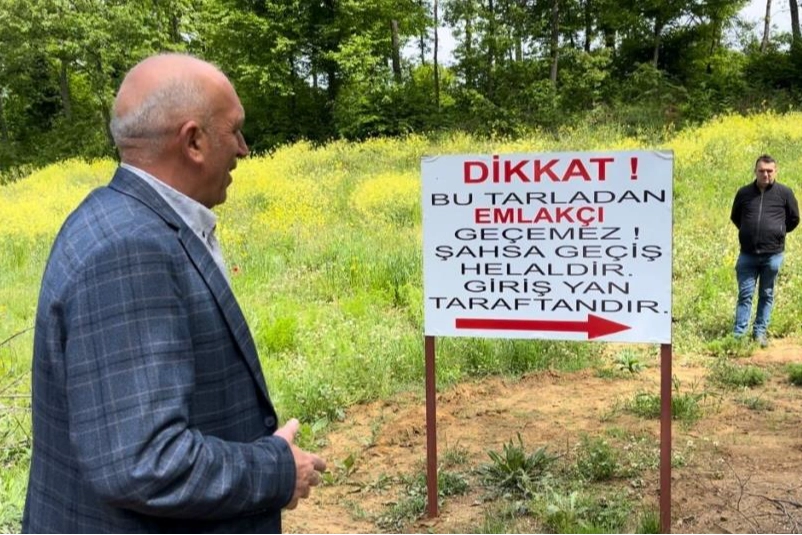 Kendisine ait tarlanın yol olarak kullanılmasına izin vermeyen Yücel Özdemir, tarlanın girişine “Buradan emlakçı geçemez, şahsa helaldir” tabelası dikti.