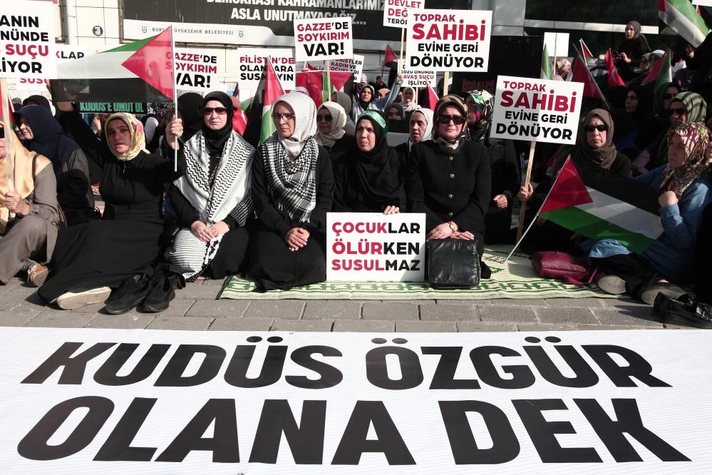 İsrail-Filistin savaşında şiddet tırmanmaya devam ederken Bursa Kadın Gönüllü Kuruluşları, savaşta zarar gören sivil halk için sessiz oturma eylemi yaptı. İsrail’in Gazze’deki hastane ve okulları vurduğunu söyleyen kadınlar savaşın bir an önce durmasını istedi.