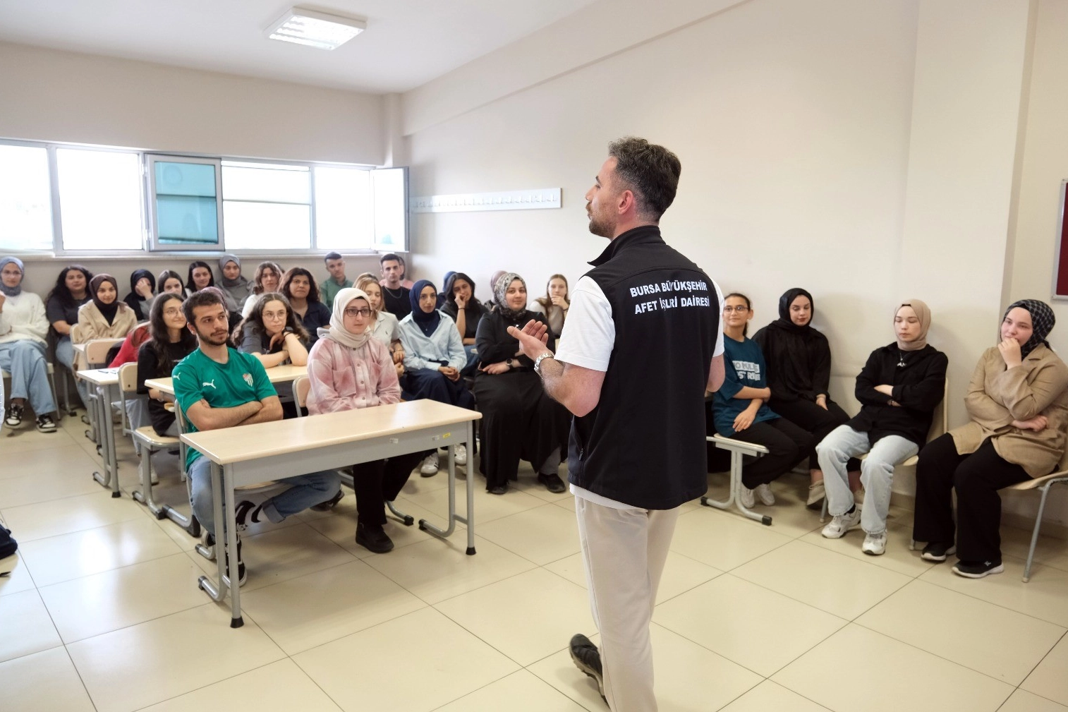 Bursa’nın daha dirençli, daha güvenli ve yaşanabilir bir kent olması için katılımcı bir anlayışla çalışmalarını sürdüren Büyükşehir Belediyesi, toplumun tüm kesimlerinde afet bilincinin oluşması için de eğitim programlarını sürdürüyor. Büyükşehir Belediyesi bünyesindeki Afet Koordinasyon Merkezi’nin (AKOM) uzman ekibi tarafından BUSMEK’in YKS Hazırlık Merkezlerinde gençlere afet farkındalık eğitimi verildi. Deprem öncesinde, sırasında ve sonrasında yapılması gerekenleri, toplanma alanlarının önemini, depremin neden olabileceği sorunları anlatan uzmanlar, afetlere karşı hazırlıklı olmanın önemini vurgulayarak neler yapılabileceğini aktardı.