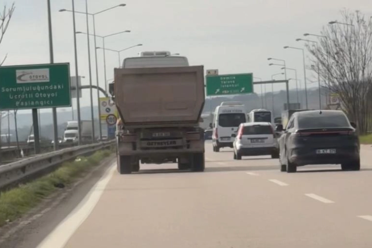 Bursa Çevre Yolu'nda seyir halinde olan bir hafriyat kamyonu, uzun araçların geçişine yasak olan en sol şeride girerek bir süre ilerledi. Kamyon sürücüsü trafik güvenliğini tehlikeye düşürerek, süratli şekilde yoluna devam etti.
