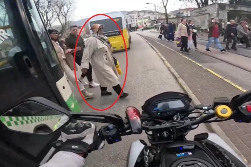 O esnada bir midibüsün önünden geçen yaya ile motosiklet sürücüsü gözgöze geldi. Muhtemel bir kaza, motosiklet sürücüsü Karakuş’un bir anlık refleksi sayesinde kıl payı önlendi.