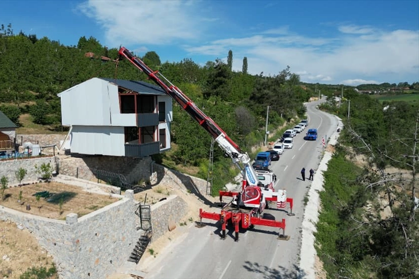 İnegöl Belediyesi'nce Şipali Mahallesi'nde gerçekleştirilen denetimlerde tarım alanına kaçak yapılan villanın sahibi 33 yaşındaki Mesut Yavuz 3 katlı çelik konstrüksiyon yapıyı vinç ile taşıdı.