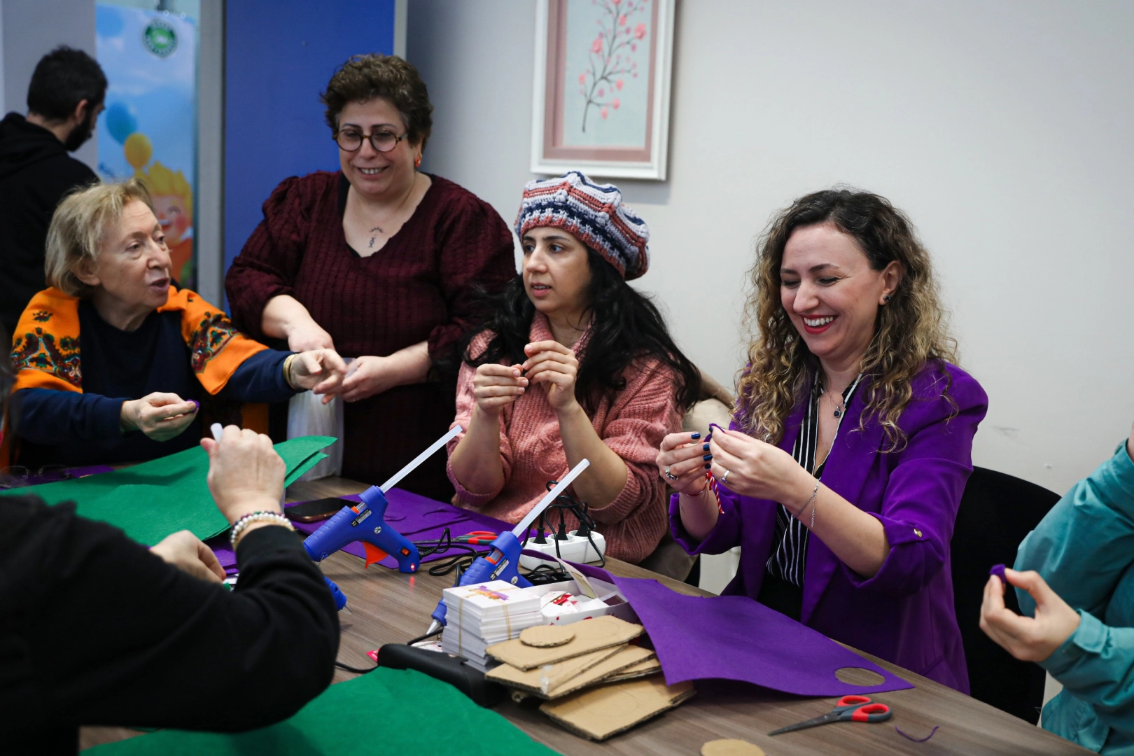 Bursa Kent Konseyi Kadın Meclisi’nde gerçekleştirilen atölye çalışmasında, keçe kumaşlar, renkli iplikler, düğmeler ve süsleme malzemeleri kullanılarak birbirinden renkli ürünler hazırlandı. Kadınların dayanışma ve ortak üretim gücünü bir kez daha ortaya koyan ürünler, 8 Mart Pazar günü yapılacak yürüyüşte kullanılacak.