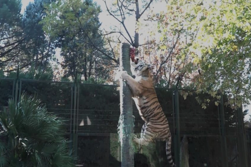 Direğin üzerine bakıcısı tarafından asılan etin kokusunu alan amur kaplanı, yuvasından çıktıktan sonra gözüne kestirdiği eti tek hamlede kaptı. Afiyetle etini yiyen kaplan, bu egzersizlerle ormanda yaşamış gibi zinde ve çevik kalıyor.
