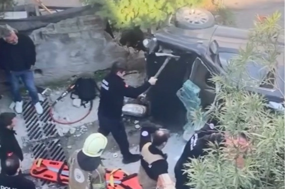 Bursa'da kaza yapan araç merdivenlerden yuvarlandı