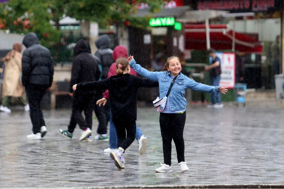 Bursa’da birden bastıran yağmura hazırlıksız yakalanan vatandaşlar sığınacak yer aradı. Bazı çocuklar ise yağmurun tadını çıkartarak hatıra fotoğrafı çektirmeyi tercih etti.