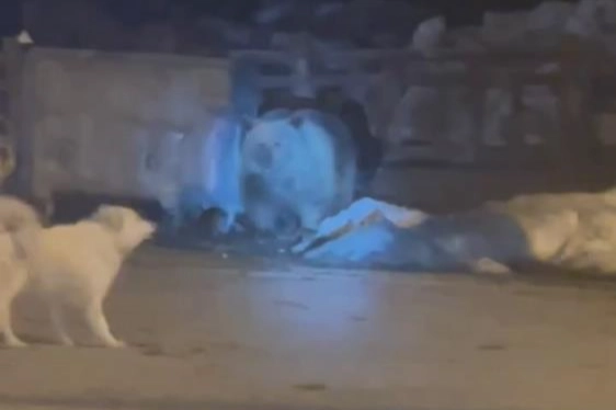 Uludağ Sarıalan'da kış uykusundan uyanan bir ayı, aç kalınca çöp konteynerlerine dadandı. Yemek arayışına çıkan ayı kovaları tek tek devirip yiyecek bulmaya çalıştı. Koruyucu köpekler tarafından rahatsız edilen ayı bir süre yemek arayıp, daha sonra ormanlık alana doğru kayıplara karıştı. O anlar bir vatandaşın kamerasına saniye saniye yansıdı.