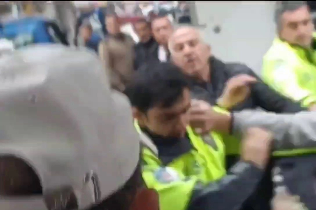 Bursa'nın Orhangazi ilçesinde uygulama yapan trafik polisleri, plakasız olduğu fark ettikleri bir motosikleti durdurdu. Sürücüye işlem yapılırken, yazılan idari ceza sonrası tansiyon arttı. Polis ekipleriyle tartışma yaşayan sürücü, kendisine ceza yazan memura yumrukla saldırdı. O anlar kameraya saniye saniye yansırken, araç sahibi gözaltına alındı. Motosiklet ise trafikten men edildi.