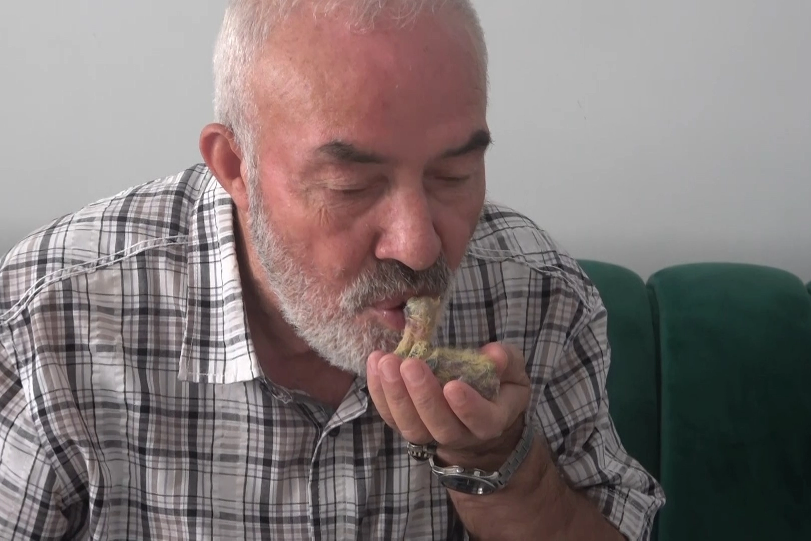 Yozgat'tan Bursa'daki oğlu ve gelinin evine misafir olarak gelen 62 yaşındaki Yusuf Ovalı, evin arkasında bulduğu ölmek üzere olan yavru güvercini eve aldı. Ağzında ekmek çiğneyerek besleyen baygın haldeki kuşu su da içirerek canlandırdı. Misafirliği süresince pamuklara sararak beslediği kuşu her gün ağzıyla besleyen Ovalı, yavru kuşun kendisini annesi sandığını ve sesini duyunca ötmeye başladığını söyledi.