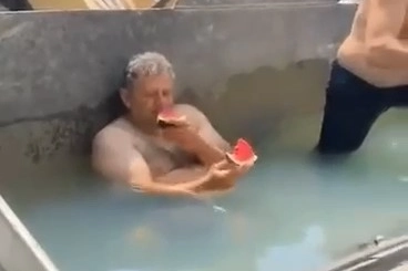 İznik ilçesinde bir inşaatta çalışan işçiler 40 derece sıcaktan bunaldı. Çare olarak kepçenin küreğine su dolduran işçiler, havuz keyfi yaptı. Kimisi suyun içinde karpuz yerken, kimisi de su içinde arkadaşına masaj yaptı. İşçiler, kepçeyi havuza çevirerek serinlediği anları amatör kamera ile ölümsüzleştirdi.