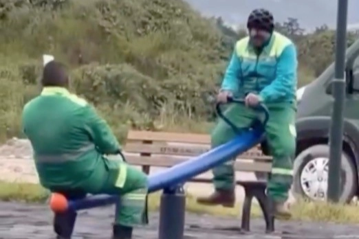 Bursa'da görev yapan belediye temizlik işçilerinin iş arası verdikleri kısa molada tahterevalliye binerek sergiledikleri samimi görüntüler gündem oldu.